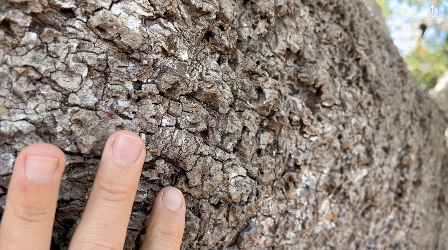 In October of 2024 I sat in the shade of one of San Diego’s most outstanding citizens. This individual who had given so much to the city over hundreds of years was about to be killed because it was the least expensive option the engineers could come up with. Brightly colored tape and survey flags, flapped in the wind, plastic harbingers of ecological destruction and bureaucratic inevitability. I ducked under the tape to get a closer look at the tree.